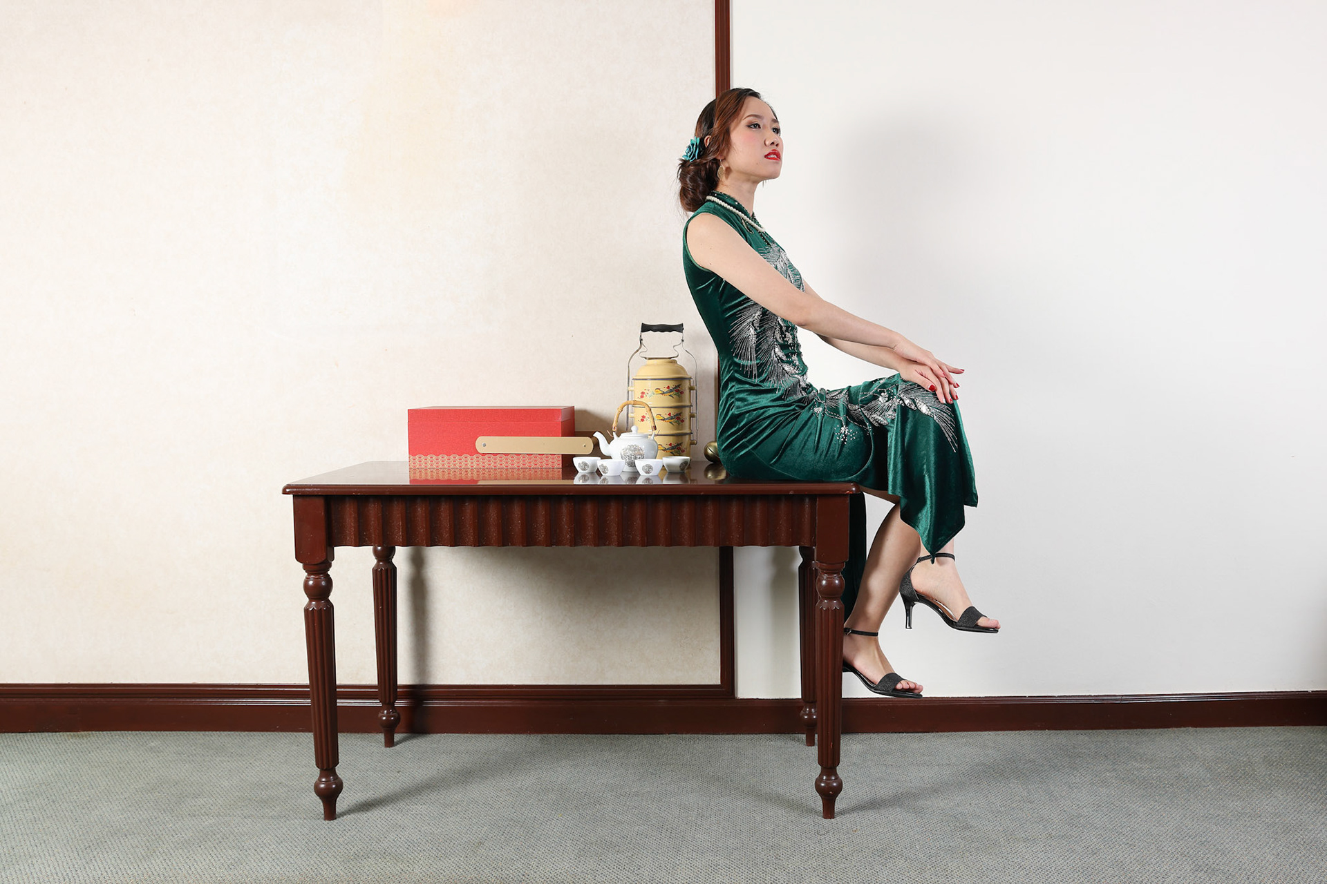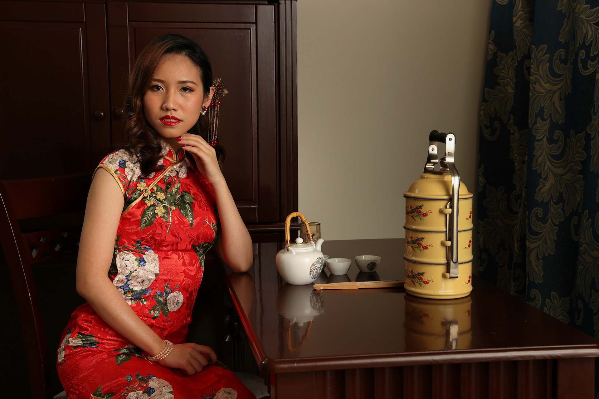 Young beautiful woman in Chinese Cheongsam modern makeup high fashion
