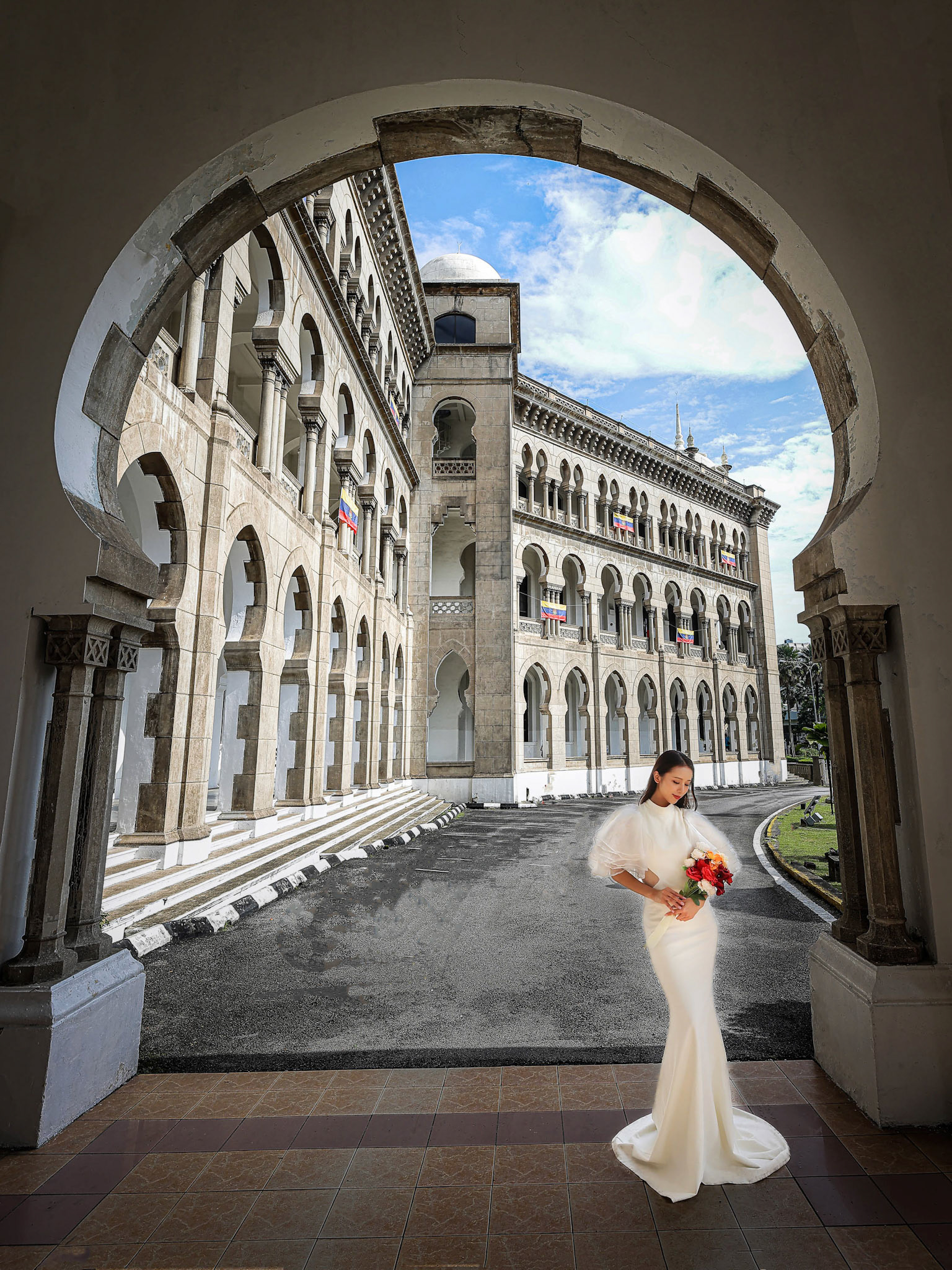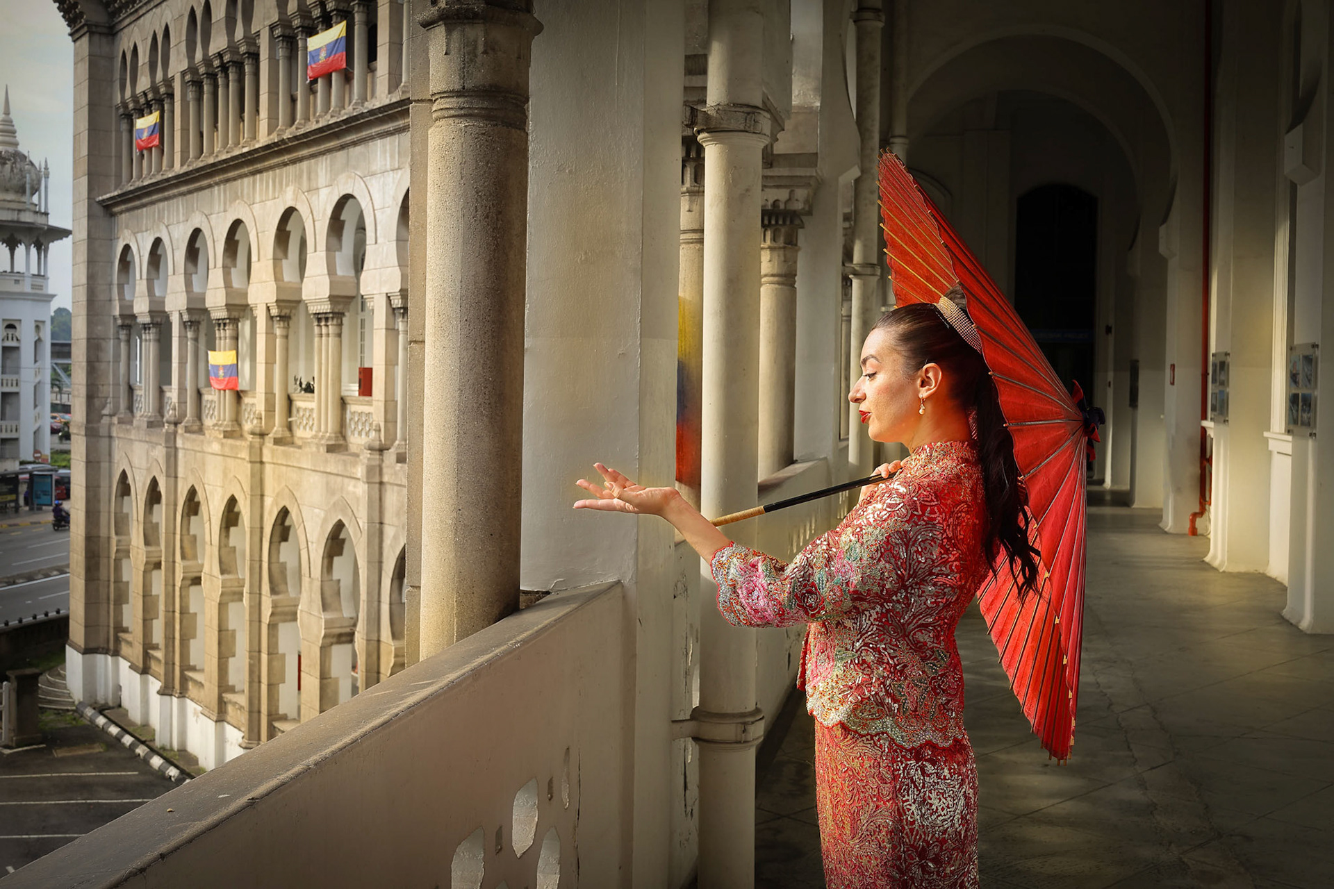 Asian woman in tractional kebaya behind umbrella on black background
