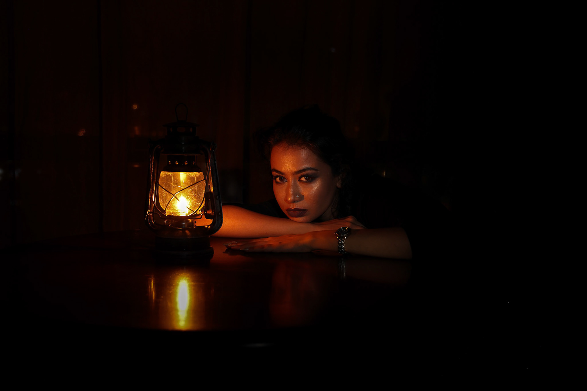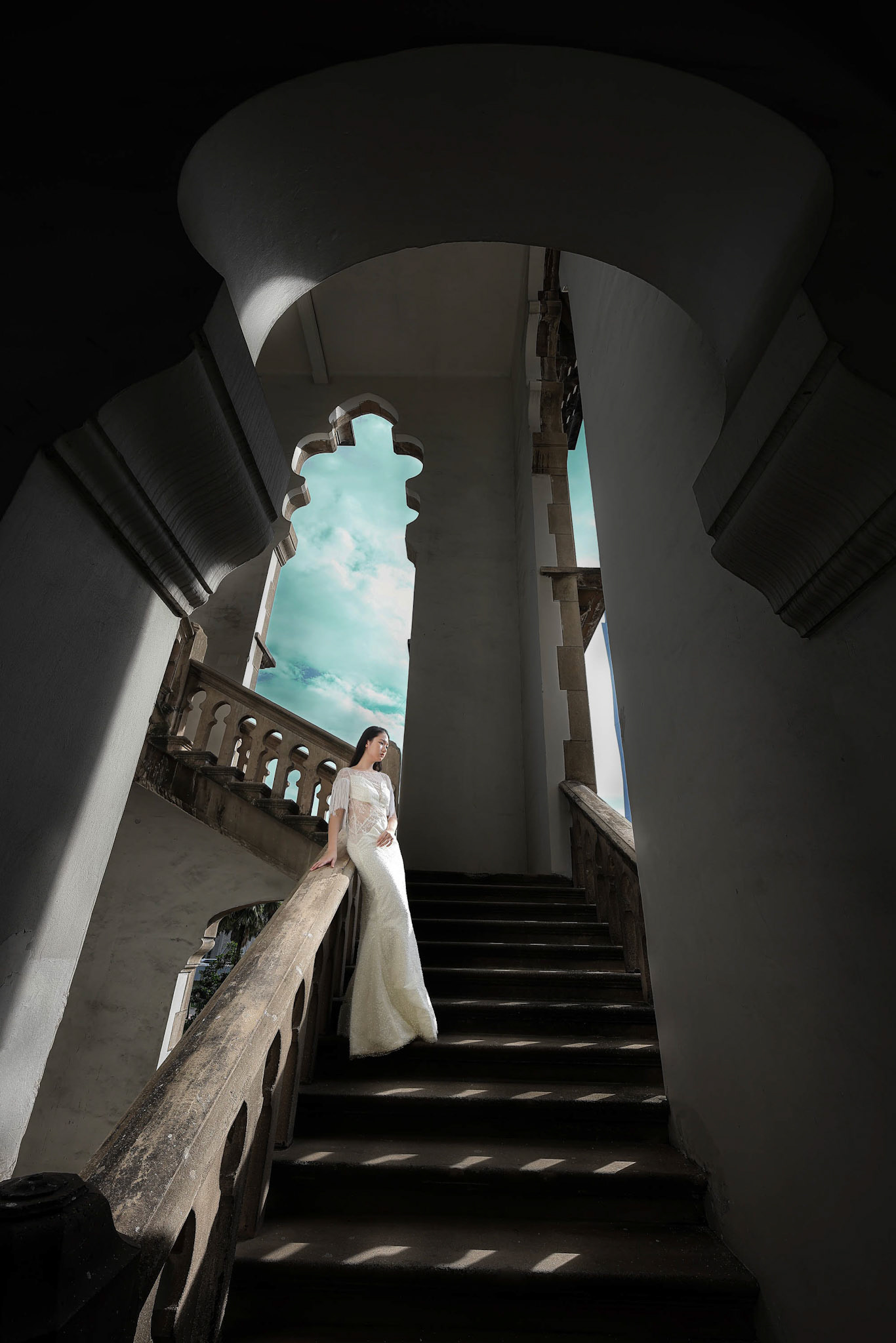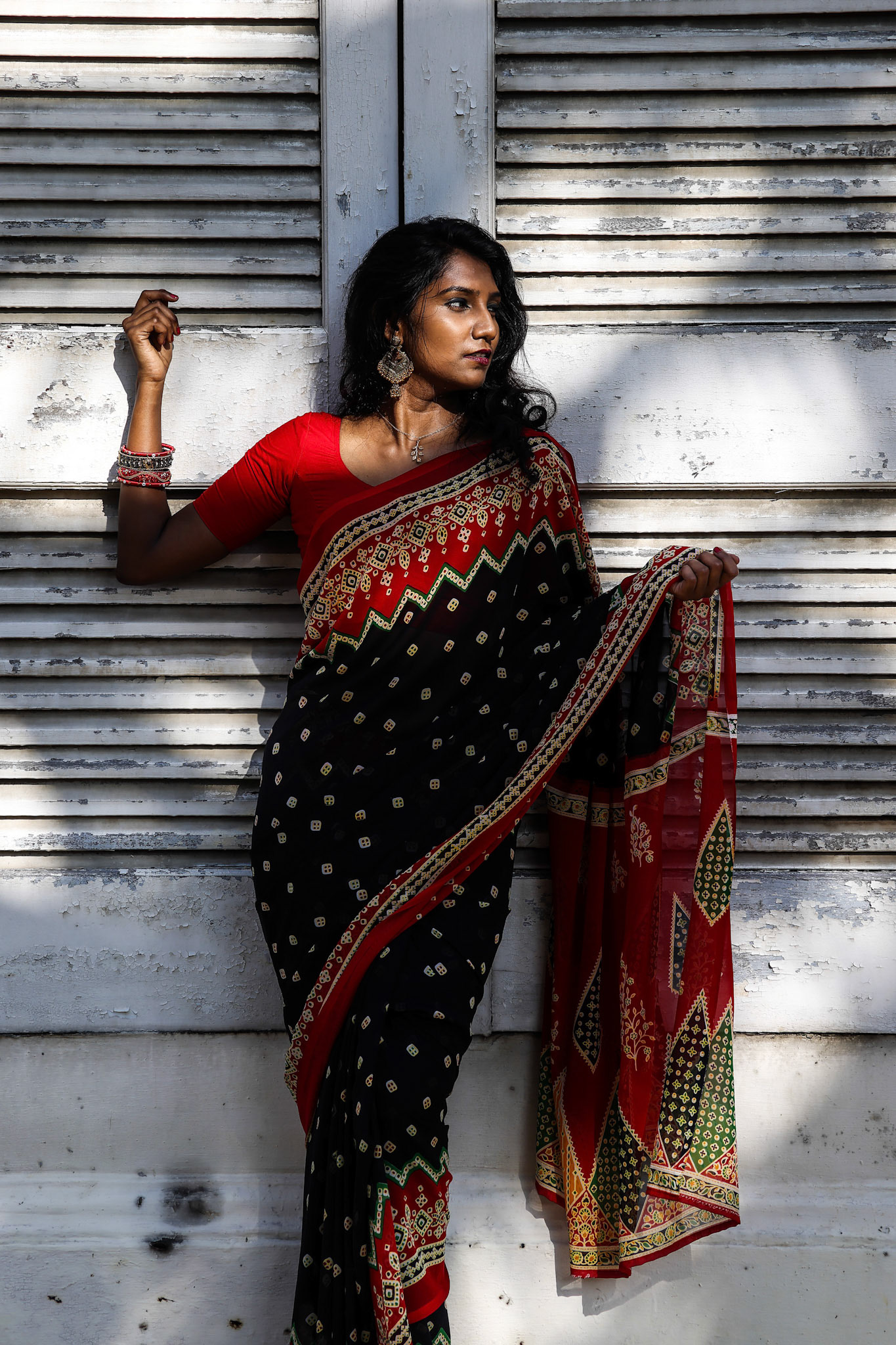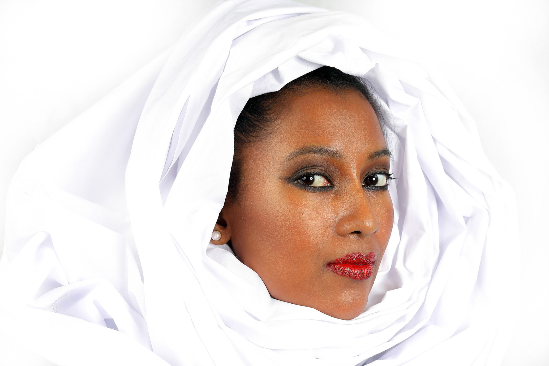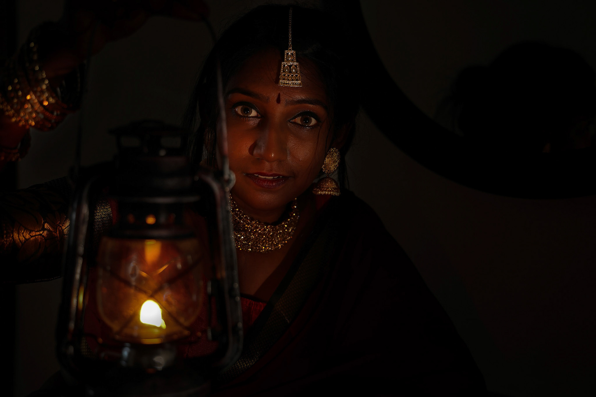Young beautiful modern Malay woman headscarf black background with gobo cast shadow on face