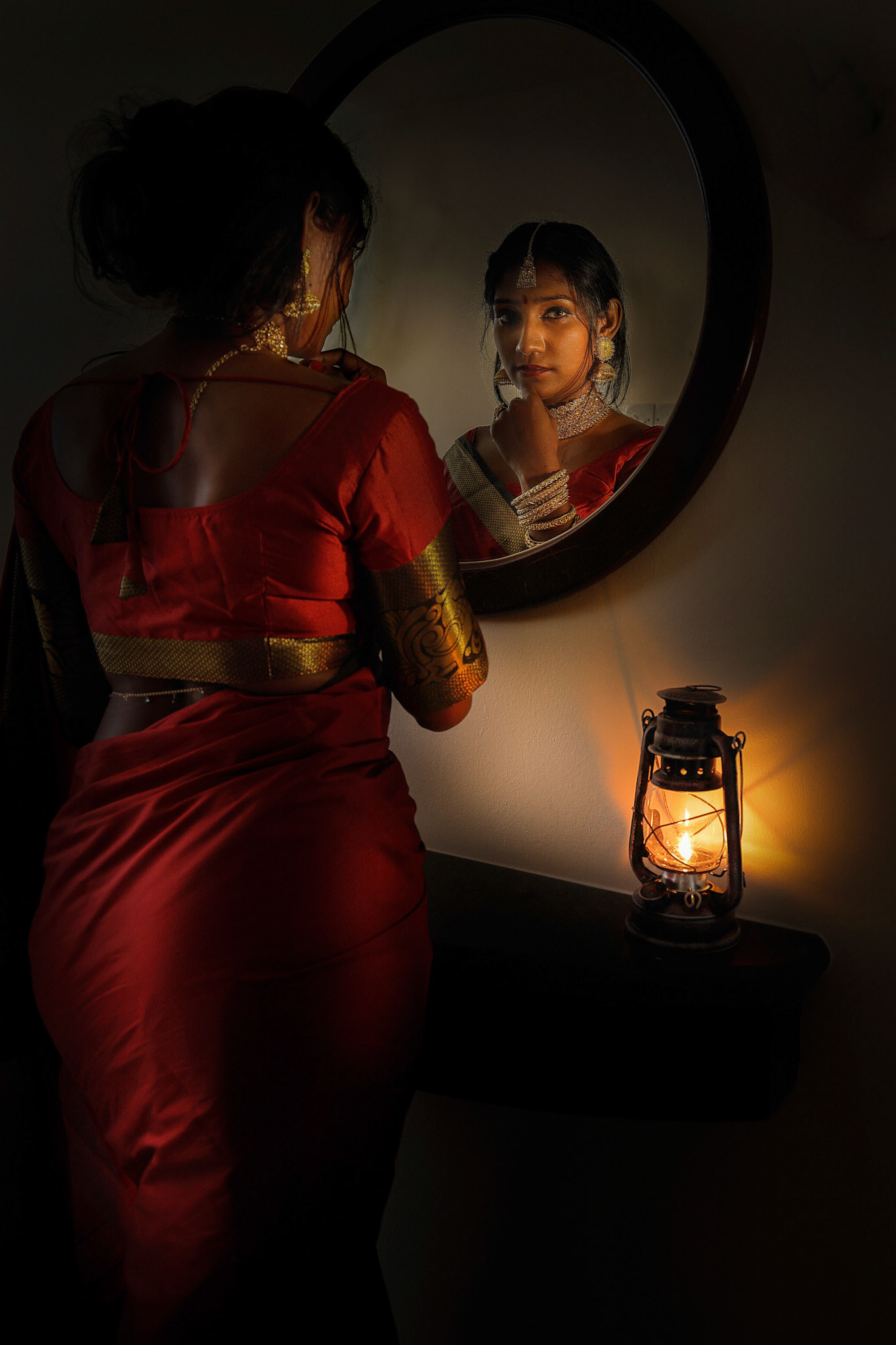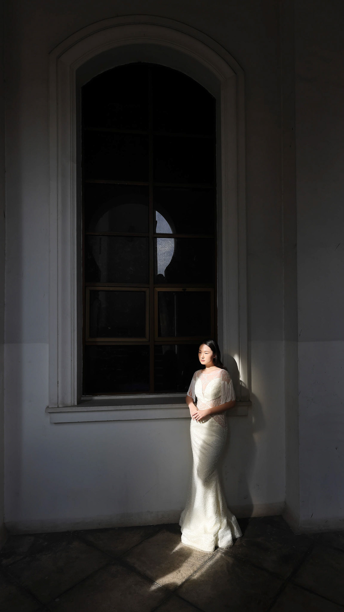 young Asian Malay muslim woman wearing headscarf baju kurung dress at home in front window mood light on face dark background peaceful content calm tranquil break trough wonder