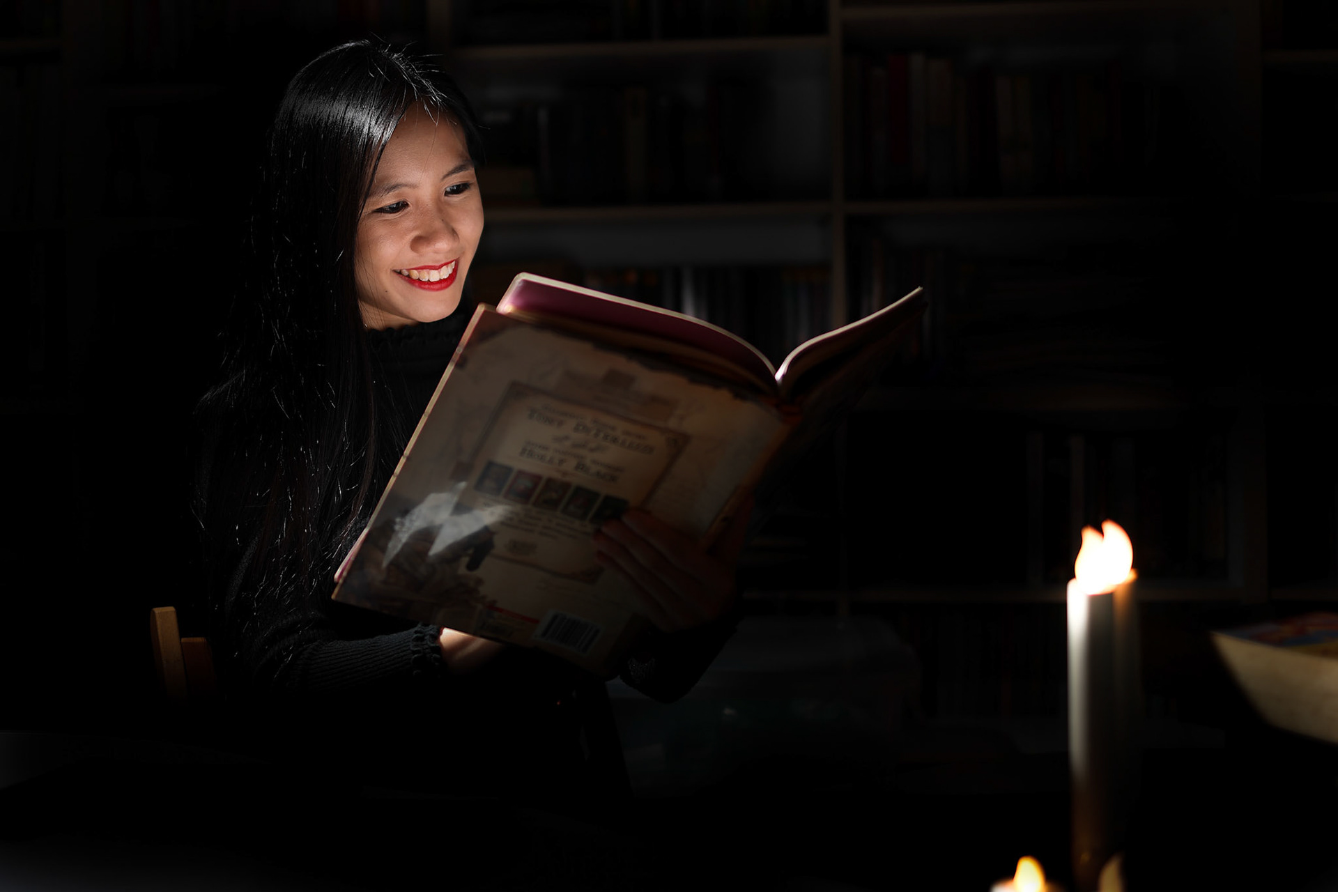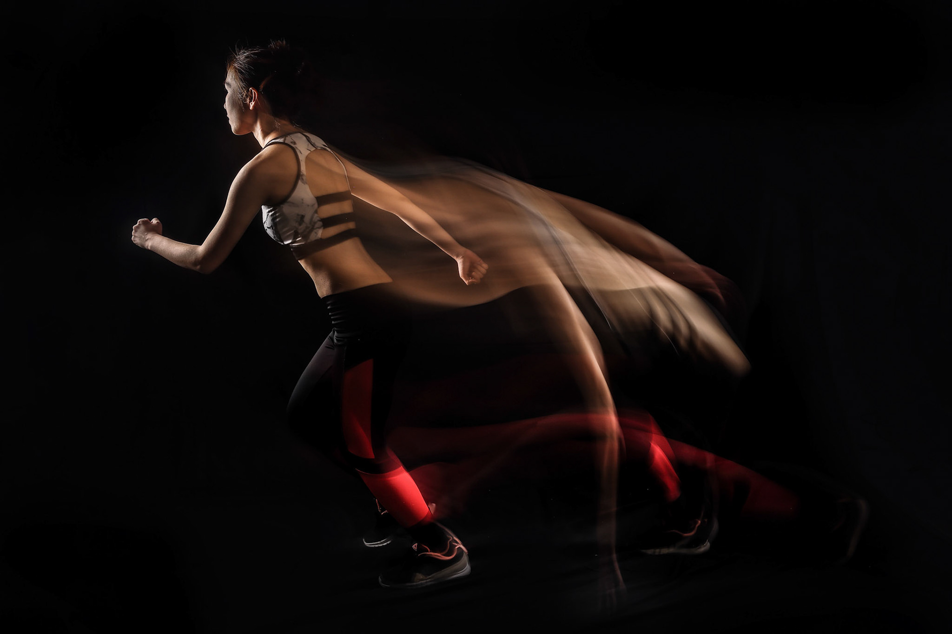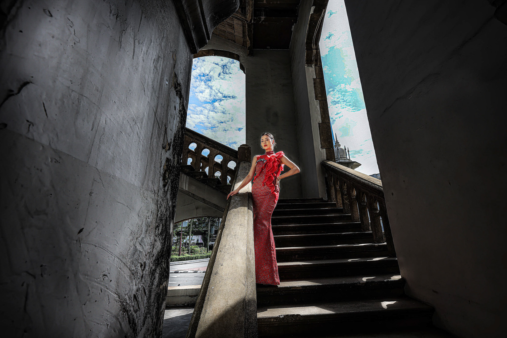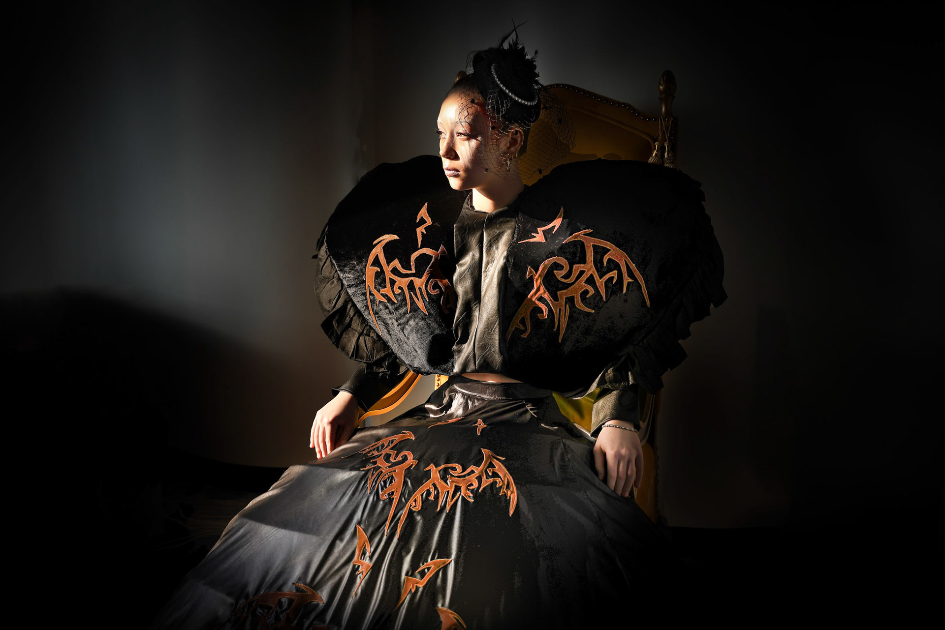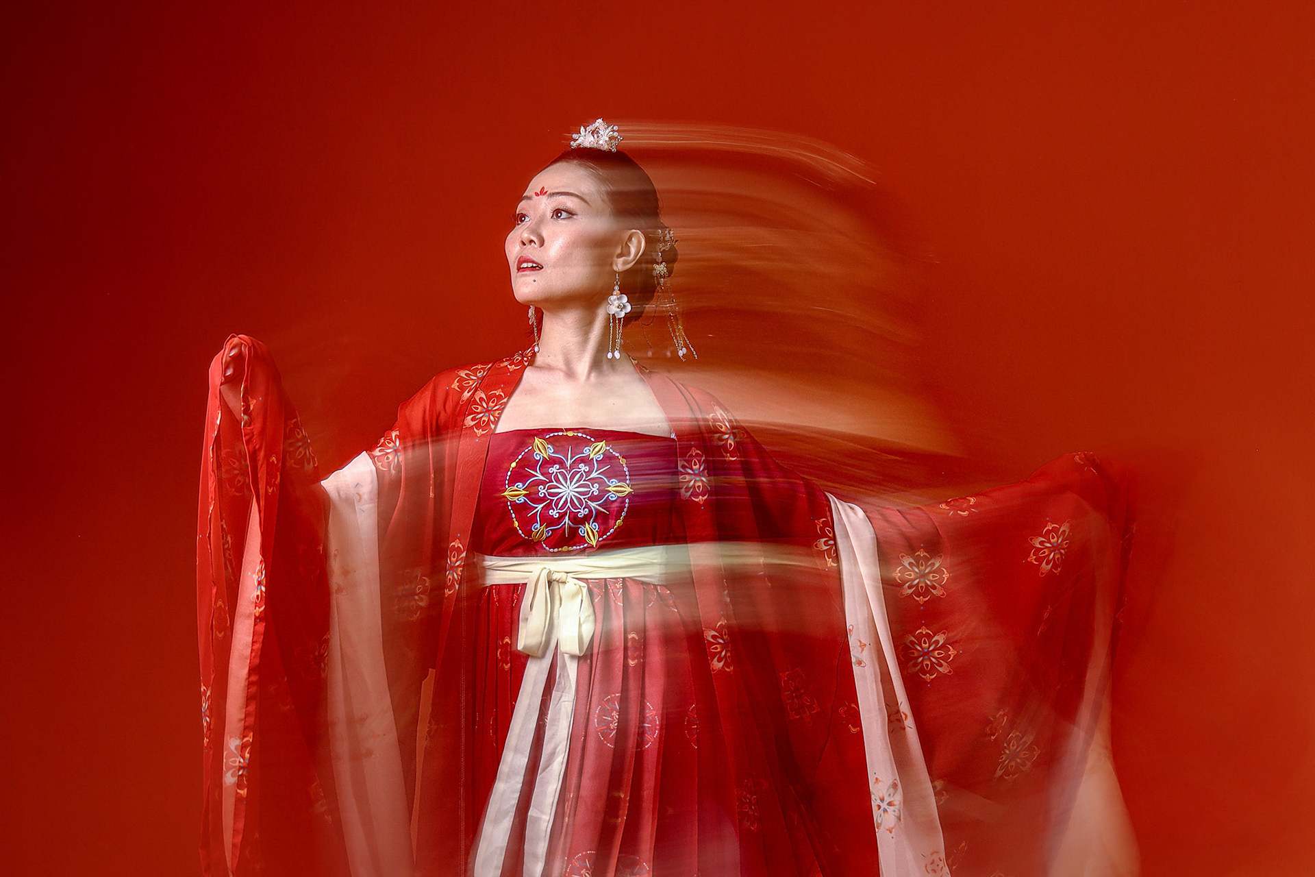 Asian woman in modern red dress under umbrella on black background