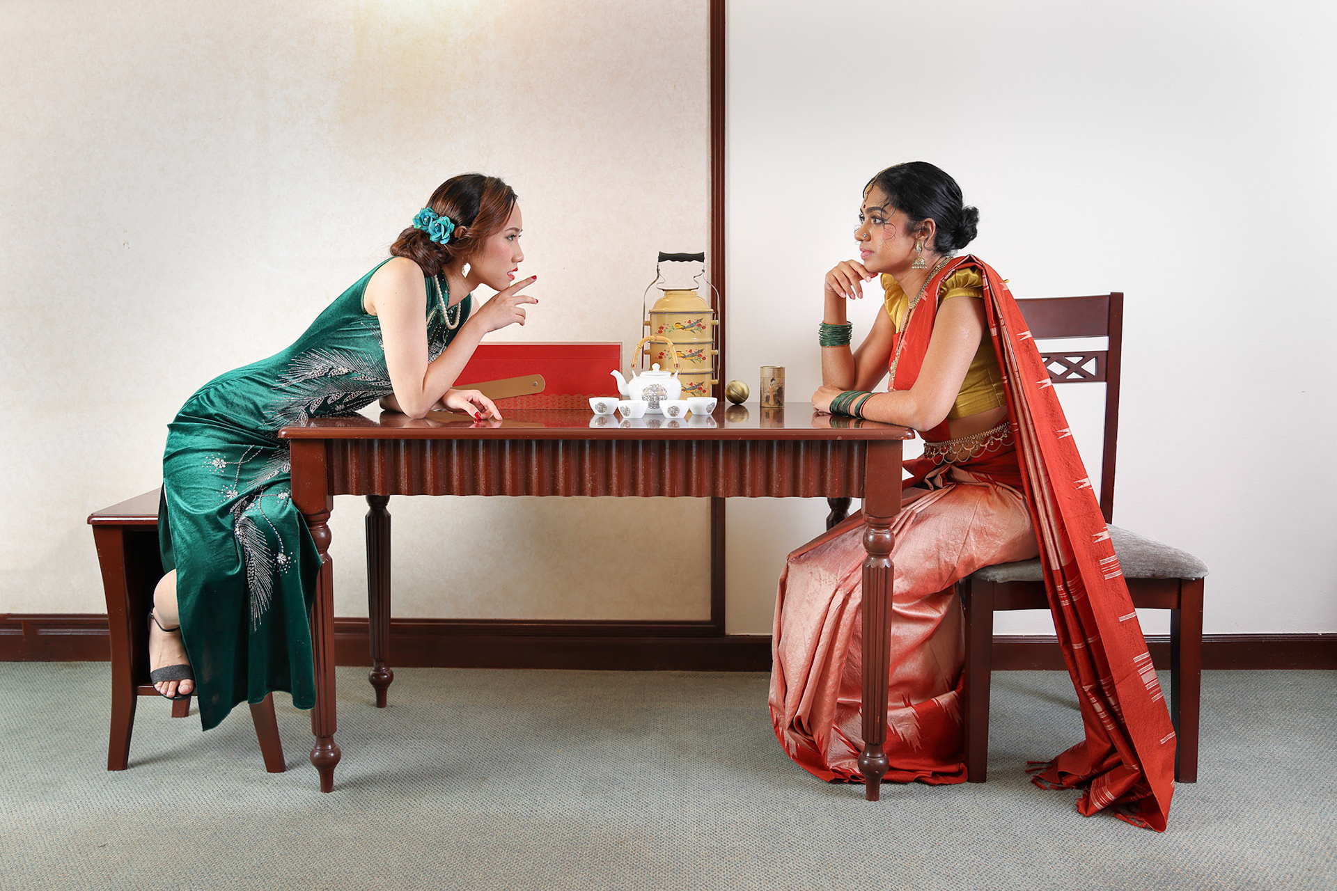 Top view of tea drink party woman hands pouring sharing teapot teacup saucer traditional biscuit Asian dress