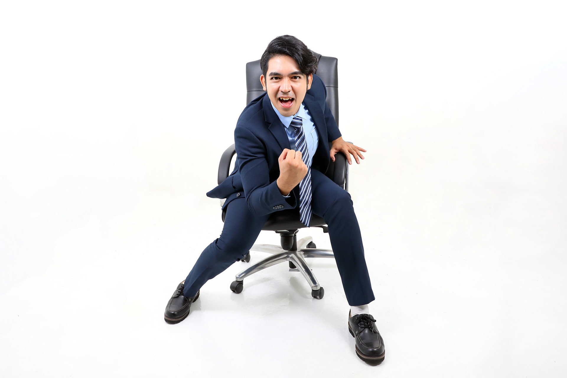 Southeast Asian young office business man wearing suit running at camera on white studio background
