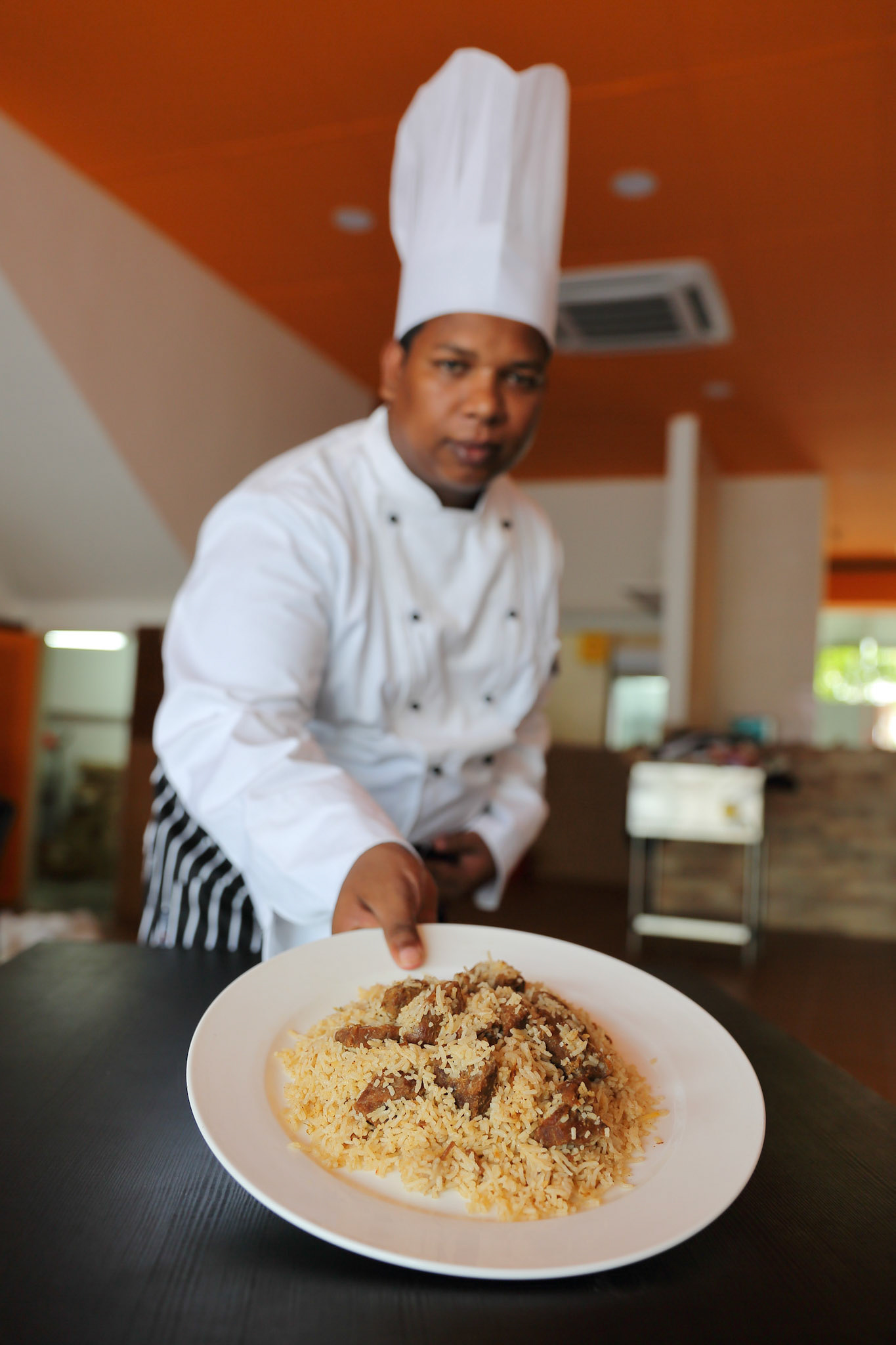 steamed Hainanese chicken rice soup green red chilli ginger soya sauce cucumber carrot side serviced on retro enamel diner plate fork spoon on wooden table