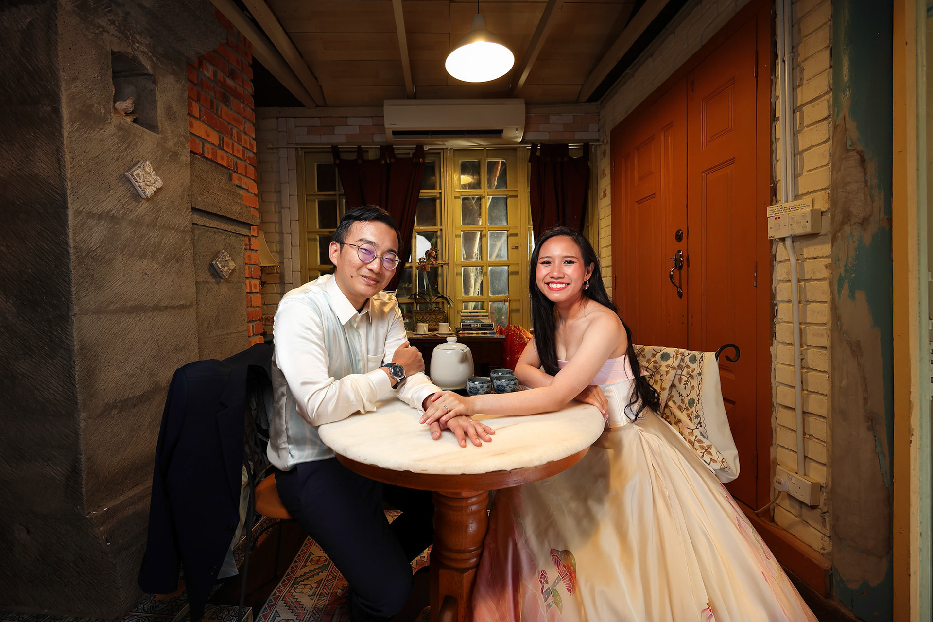 Southeast Asian young office business man woman happy smile dance on white studio background